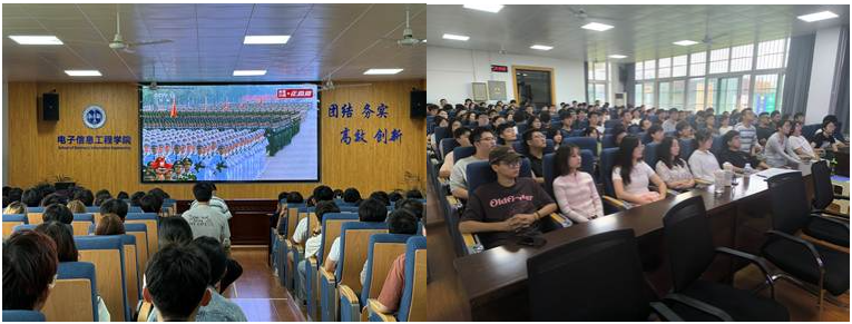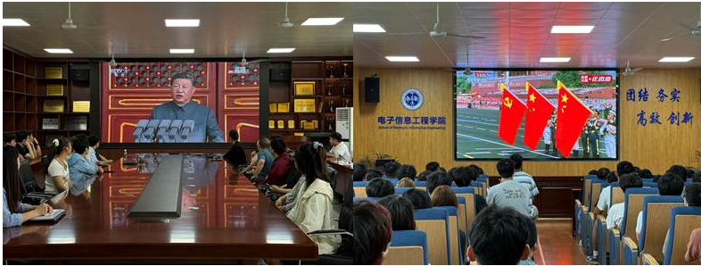 2025年9月3日,纪念中国人民抗日战争暨世界反法西斯战争胜利80周年阅兵式在北京天安门广场隆重举行。为铭记历史、缅怀先烈,弘扬伟大抗战精神,激发爱国热情与使命担当,电子信息工程学院组织师生于教5-422和教5-424集中观看“九三阅兵”现场直播,共同见证这一庄严而光荣的历史时刻。